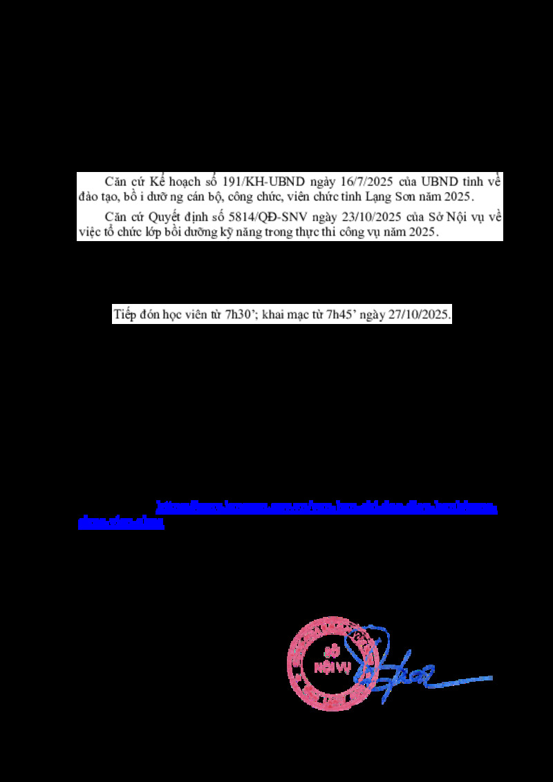 | Tiêu đề văn bản | Về việc thông báo thời gian, địa điểm tổ chức lớp bồi dưỡng kỹ năng trong thực thi công vụ năm 2025 | ||