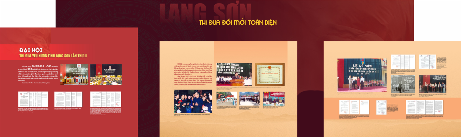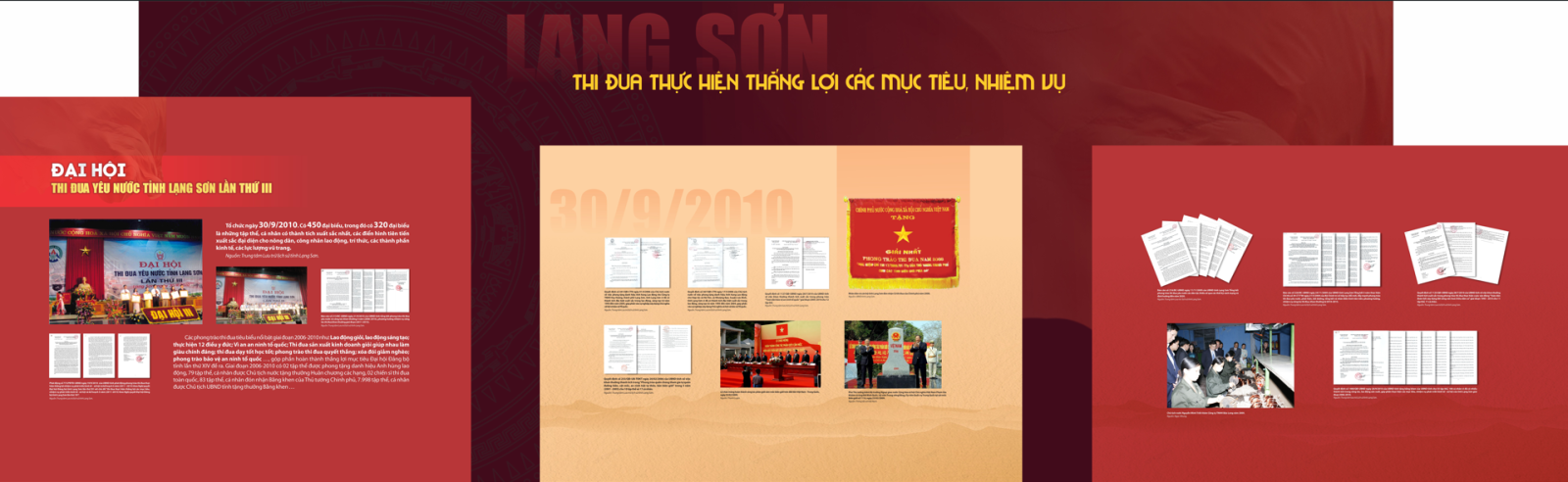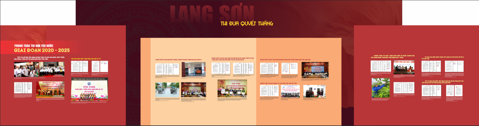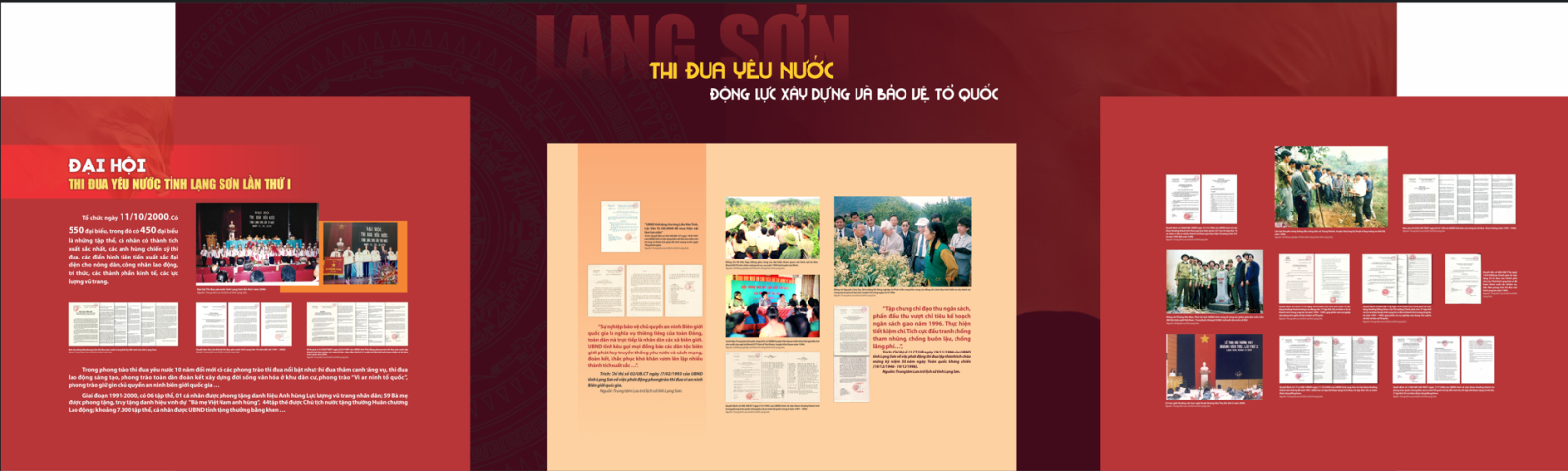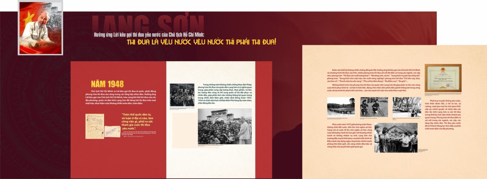 Với trên 180 tài liệu, hình ảnh, câu trích được lựa chọn từ Trung tâm Lưu trữ quốc gia III, Trung tâm Lưu trữ lịch sử, Sở Nội vụ và các tổ chức, cá nhân đưa ra trưng bày, giới thiệu khái quát về sự ra đời của lời kêu gọi thi đua ái quốc của Hồ Chủ tịch và phong trào thi đua yêu nước của Nhân dân các dân tộc tỉnh Lạng Sơn qua các kỳ Đại hội thi đua yêu nước, các gương điển hình tiên tiến. Những thành tựu, kết quả quan trọng trong thực hiện nhiệm vụ phát triển kinh tế, xã hội, bảo đảm quốc phòng, an ninh. Lạng Sơn ngày càng phát triển, vững vàng trên vùng biên giới phía Bắc của Tổ quốc.